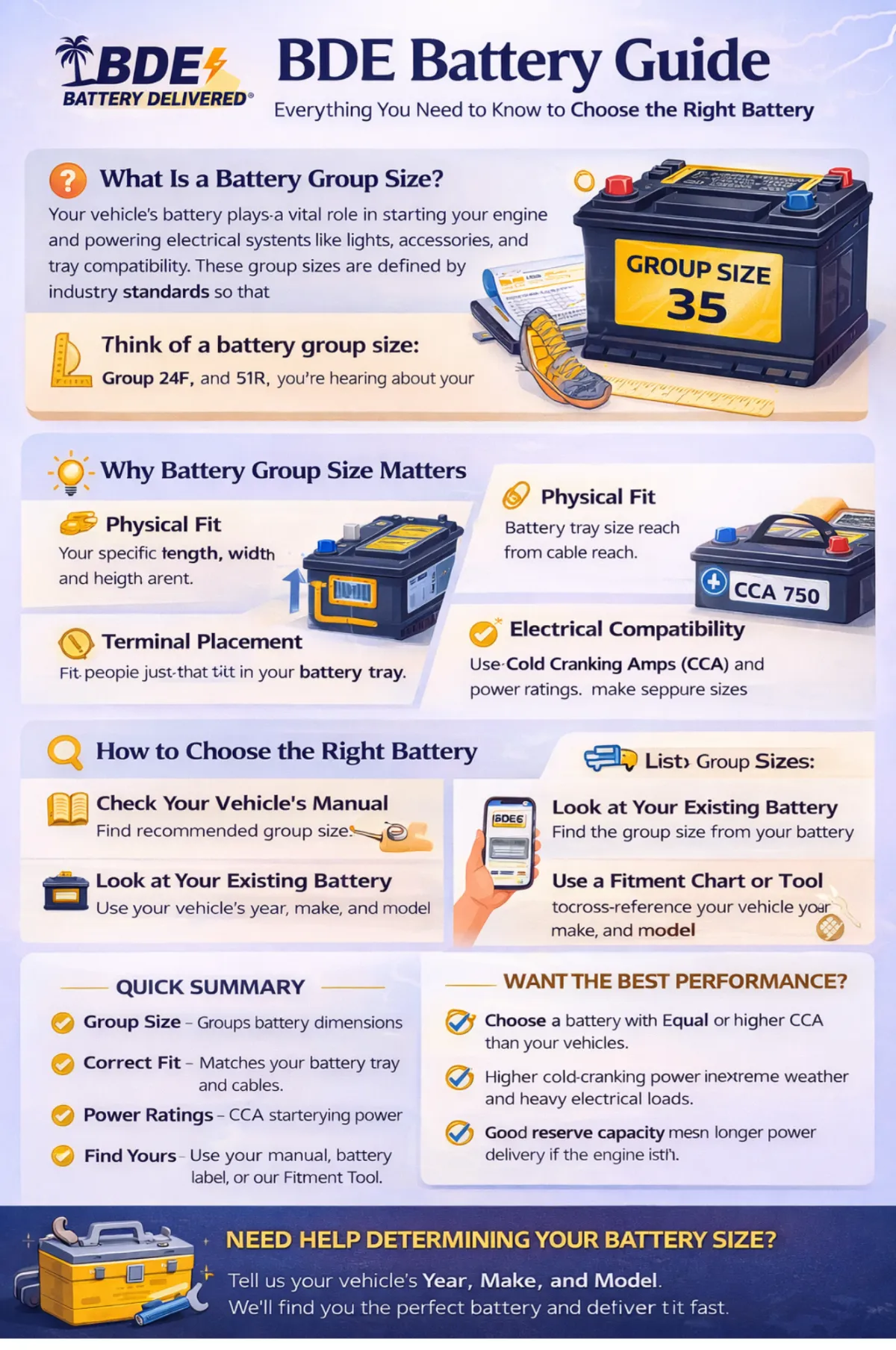 Battery fitment tools — like the one we use at Battery Delivery Express — help cross-reference your vehicle year, make, and model with the correct group size. That way, you get a proper match every time.